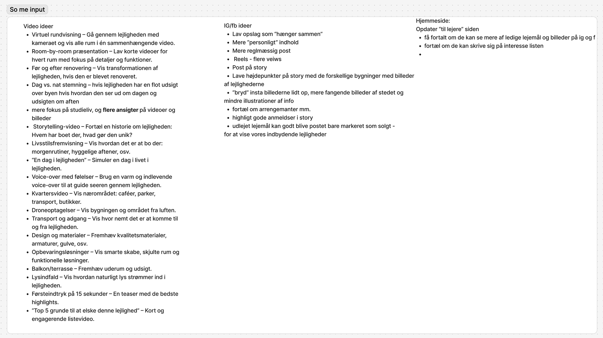 Da jeg havde fået et overblik over min research, begyndte jeg at notere idéer til, hvordan Egnsinvests SoMe-profiler kunne optimeres.